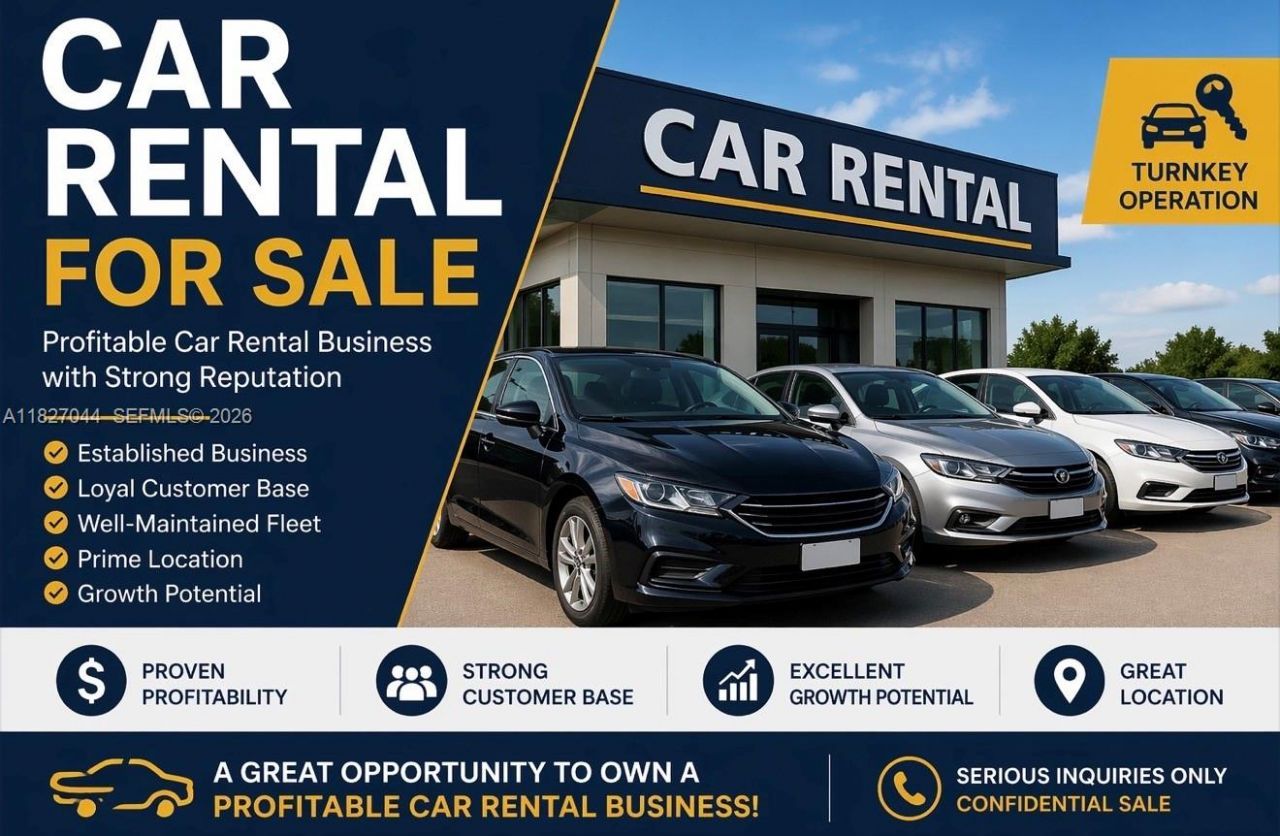 Incredible opportunity to acquire a well-established and highly profitable car rental agency operating in three of Floridas busiest markets: Miami, Orlando, and Fort Lauderdale. This business has been successfully operating for nearly 10 years, building a solid reputation and a loyal client base of both tourists and locals. Fleet of 150 Vehicles ? including compact cars, sedans, SUVs, minivans, sports cars, and convertibles ? with an estimated value of $3.5M. State-of-the-Art Technology ? includ...Incredible opportunity to acquire a well-established and highly profitable car rental agency operating in three of Floridas busiest markets: Miami, Orlando, and Fort Lauderdale. This business has been successfully operating for nearly 10 years, building a solid reputation and a loyal client base of both tourists and locals. Fleet of 150 Vehicles ? including compact cars, sedans, SUVs, minivans, sports cars, and convertibles ? with an estimated value of $3.5M. State-of-the-Art Technology ? includes a modern rate management system and rental car software, streamlining operations and maximizing revenue. Turnkey Operation. Growth Potential ? opportunities to expand through digital marketing, partnerships with hotels and travel agencies, or adding new locations. POF and NDA required.Terms to Proceed Prior to detailed negotiations, the buyer must provide a signed NDA and proof of liquid funds or a bank pre-qualification letter.To initiate due diligence, the buyer must execute a LOI, APA or SPA and provide an escrow deposit equal to one percent (1%) of the Business value. Escrow terms: If the buyer withdraws from the transaction or fails to complete the purchase for any reason, USD 4,000 from the escrow deposit shall be released to the seller to cover legal and administrative expenses. If the transaction closes, the escrow deposit shall be applied to the final purchase price. The seller does not provide seller financing.